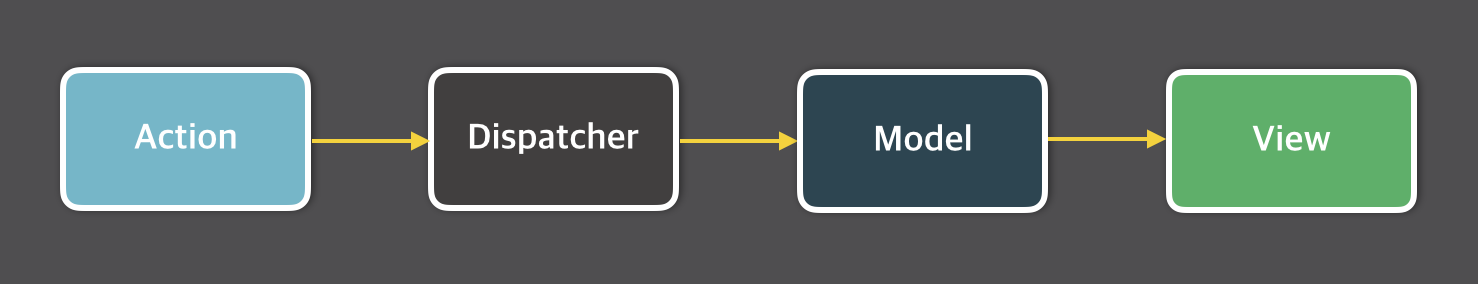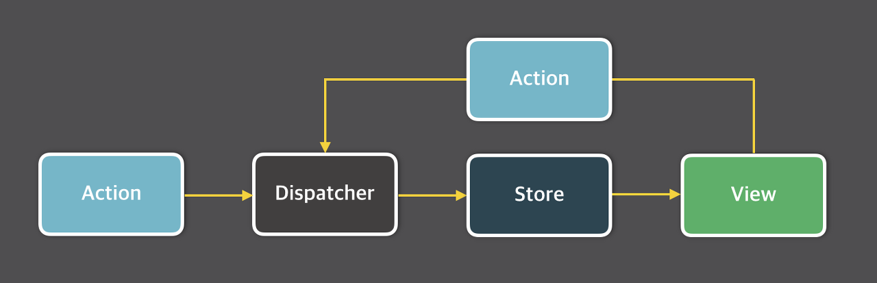 Flux는 사용자 입력을 기반으로 Action을 만들고 Action을 Dispatcher에 전달하여 Store(Model)의 데이터를 변경한 뒤 View에 반영하는 단방향의 흐름으로 애플리케이션을 만드는 패턴입니다.