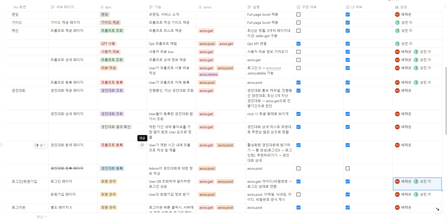 프론트 개발 사항과 진행을 한 눈에 보기 위해 노션으로 정리했다.